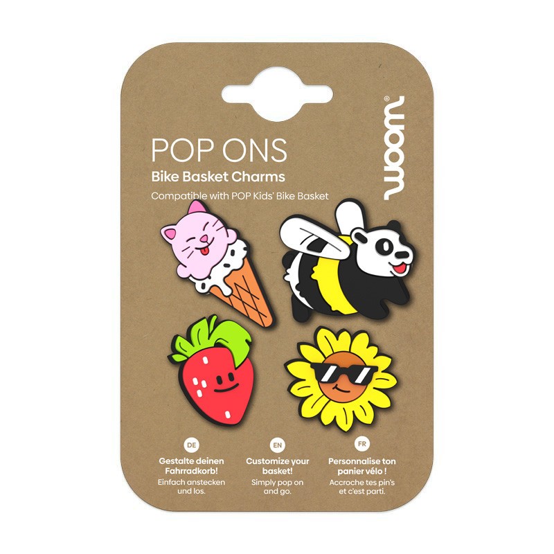 Zabawne przypinki, dzięki którym Twoje dziecko może spersonalizować swój koszyczek rowerowy woom POP, aby frajda na rowerze była jeszcze większa!